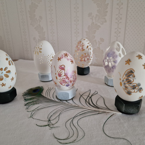 Oeufs d'oies et d'Emeux peints à la cire chaude des supports d'oeufs d'autruches, bois précieux, plusieurs bois, teintes, diam. ext 12cm, 40€ fpc Oeufs d'oies sculptés peints Oeufs de poules ou d'oies traditionnels inspirés de la faïence de Wloclawek, village Polonais, by Krystyna Zagrabska Oeufs d'oies dentelle, me contacter pour disponibilité et prix Oeufs style Fabergé, poules, oies, me contacter pour disponibilité et prix Oeuf bois peint traditionnel Russe 14 cm sur son support, 80 € frais de port compris Oeufs de poule Pisanky de Roumanie, 25€ l'oeuf au choix port compris Oeufs de poules Pisanky de Roumanie, au choix 25€ pièce port compris Inclusions et tissages 230€ Oeuf sortant d'un oeuf en fer 120€ Inclusion d'un oeuf d'oie sculpté dans un oeuf d'autruche découpé peint 240€ Oeuf d'autruche gravé déco tribale 230€ Tableau demi-oeuf d'autruche gravé et éclairé de l'intérieur 250€ Sculpture Oeuf et ses pétales 220€ Oeuf d'oie avec inclusions, aspect vieilli sur son support 120€ Oeuf d'oie peint inspiration très moderne 110€ Oeuf comme une fleur et ses pétales 210€ Ballon de rugby, oeuf d'autruche, 150€ Cadre demi-oeuf d'autruche gravé peint 220€ Sculpture oeuf autruche vieilli inspiration harpe 210€ Coffret oeuf d'autruche inspiration asiatique 195€ Coffret oeuf d'autruche peint 195 € Coffret oeuf de nandou couché délicatement peint 240€ Oeufs bois peints style Pisanky Ukrainien, marron 6 cm 35€, boite bijoux 13 cm 80€, coq 8 cm 60€ Oeuf d'autruche sculpté motifs géométriques intemporel, sur tube lumineux noir 210 € Oeuf d'autruche sculpté motifs floraux vintage sur tube lumineux noir 210€ livré en France Oeuf d'autruche gravé sculpté papillons sur tube lumineux moderne noir 210€ Oeuf d'autruche sculpté teinté sépia sur tube lumineux 210€ Oeufs d'autruche sculpté teinté noir sur tube lumineux moderne noir 210€ Oeufs d'autruche sculptés décoratifs sur.petit support bois unitaire 180€ Duo d'œufs de poules peints déco traditionnel Pisanky 85€ Oeuf d'autruche couché sculpté fleurs 210€ Oeufs d'autruche lampes sur supports tubes différents coloris 210 € Splendide oeuf d'oie peint paysage sur son pied métal doré, réalisé par Brigitte 75€ Oeuf d'autruche peint Masque Africain et son support en chêne fumé 200 € Oeuf d'autruche peint décor Africain sur son socle noir 85 € Oeuf d'autruche peint Africain et ses masques sur son support en merisier 180 € Coffret Fabergé, oeuf d’oie peint rose sur pieds, réalisé par Brigitte, 85 € Oeuf d'autruche sculpté d’un décor équestre sur support bois pommier et son coffret, réalisé en Italie, 250 € Oeuf d’autruche sculpté de motifs floraux sur socle bois, décoratif, réalisé par Isabelle Franconie 150 € Oeuf d’autruche, décor Carpes koï, sculpté et gravé, réalisé par Isabelle Franconie sur support bois chêne fumé 280 € Oeuf d'oie sculpté sur support bois, réalisé par Isabelle Franconie 85 € Coffret style Fabergé réalisé par Jean François, oeuf d'émeu couché sur socle, capitonné de velours 220 € Duo d’oeufs en bois peints de motifs traditionnels Pisanky, d’origine Tchèque, Prague, 85 €