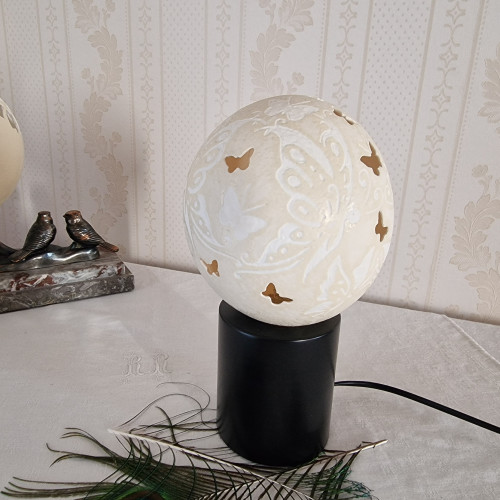Gros oeuf autruche, très rond et volumineux, sculpté et gravé de motifs papillons, sur tube moderne noir