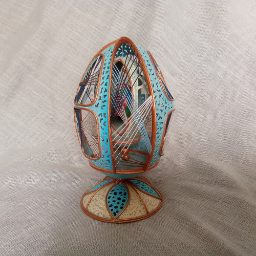 Oeuf découpé peint laissant apparaitre ses inclusions et tissages, réalisé par Jean François