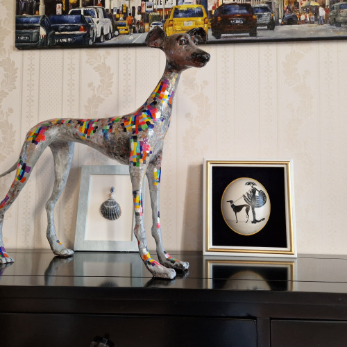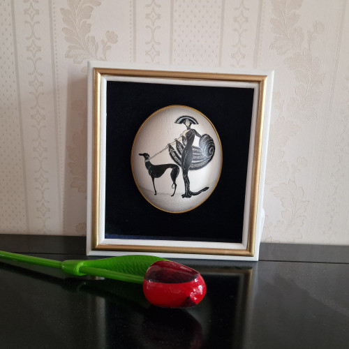 l'Oeuf transformé en toile de Maître ! demi-oeuf d'autruche délicatement peint par Jean François et exposé dans un cadre américain