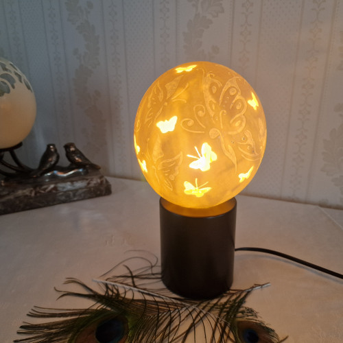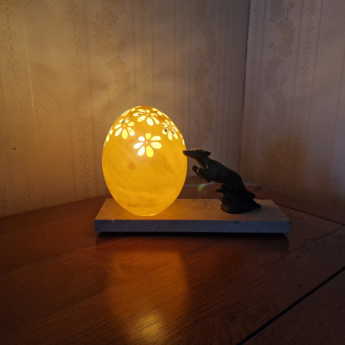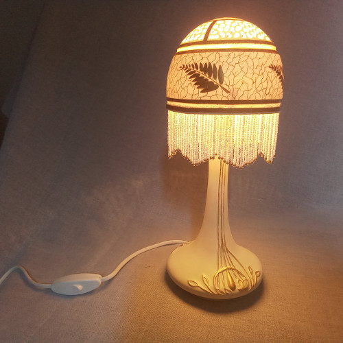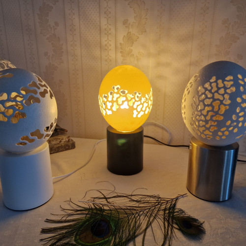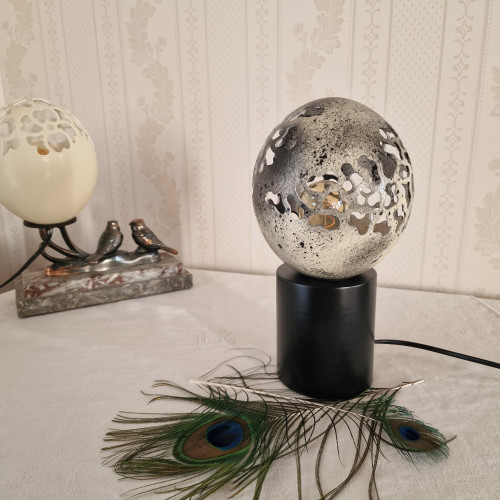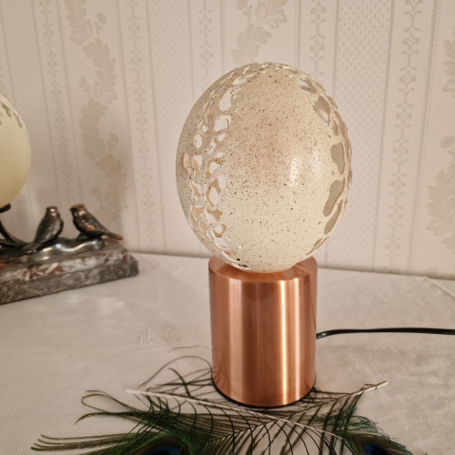 Lampe vintage inspiration début XIXème, avec cet oeuf d'autruche à franges, sculpté et peint sur pied